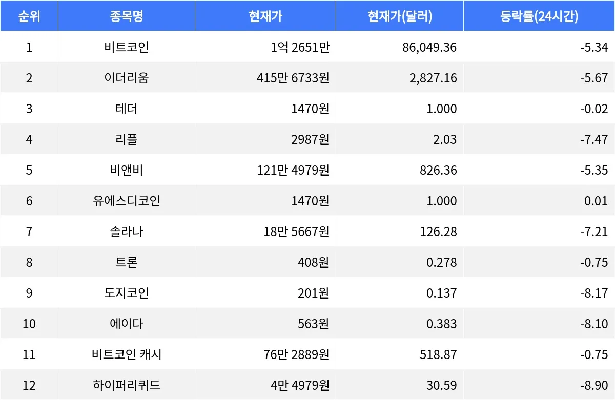 1일 글로벌 가상자산 시황 중계 사이트 코인마켓캡(CoinMarketCap)에 따르면, 비트코인의 현재가는 1억 2651만원이며, 24시간 등락률은 -5.34%를 기록하고 있다. 비트코인은 탈중앙화된 디지털 통화의 대표주자로, 블록체인 기술을 활용하여 안전한 거래 시스템을 제공한다. 비트코인의 24시간 거래량은 86조 9929억원이다.