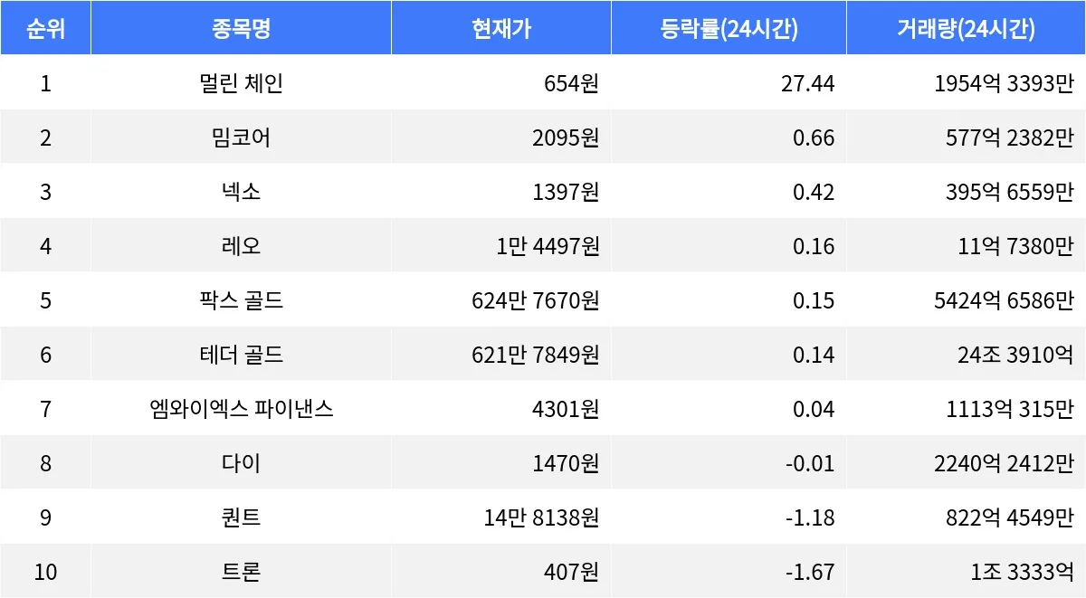 글로벌 가상자산 시황 중계 사이트 코인마켓캡(CoinMarketCap)에 따르면, 최근 암호화폐 시장에서 멀린 체인이 24시간 동안 가장 높은 상승률을 기록하며 주목받고 있다. 멀린 체인은 27.44% 상승하며 현재 654원에 거래되고 있으며, 24시간 거래량은 1954억 3393만 원에 달한다. 시가총액 순위는 95위에 위치하고 있으며, 1시간 동안 1.43% 하락한 것으로 나타났다. 이러한 하락에도 불구하고 전반적인 상승 추세는 여전히 강력하다.