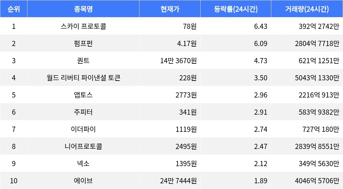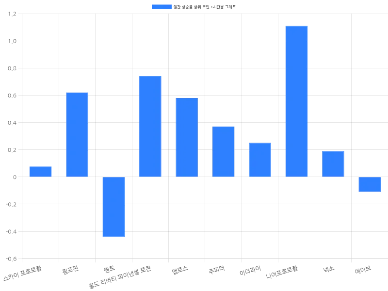 같은 시각, 니어프로토콜은 24시간 동안 2.47% 상승하며 현재 2495원에 거래되고 있으며, 1시간 동안 1.11% 상승하며 강력한 단기 상승세를 기록하고 있다. 넥소는 24시간 동안 2.12% 상승하며 현재 1395원에 거래되고 있으며, 최근 1시간 동안 0.19% 상승했다. 에이브는 24시간 동안 1.89% 상승하여 현재 24만 7444원에 거래되고 있다. 1시간 동안 0.11% 하락했지만, 전반적인 상승 흐름은 유지되고 있다.