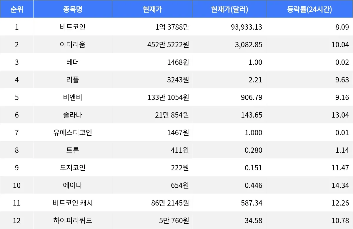 솔라나는 21만 854원으로 13.04% 상승하였고, 24시간 거래량은 10조 802억 원이다. 솔라나는 고속 블록체인 플랫폼으로, 높은 처리량과 저렴한 거래 수수료를 제공하여 다양한 디앱과 디파이 프로젝트에 활용된다.