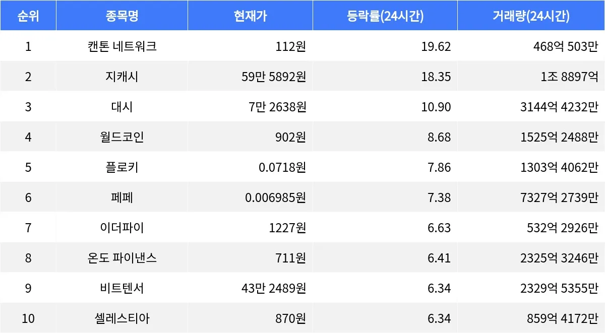 같은 시각 페페는 24시간 동안 7.38% 상승하며 0.006985원에 거래되고 있으며, 24시간 동안 7327억 2739만 원의 거래량을 기록했다. 이더파이는 6.63% 상승하며 1227원에 거래되고 있으며, 24시간 거래량은 532억 2926만 원이다. 온도 파이낸스는 6.41% 상승하며 711원에 거래되고 있으며, 24시간 거래량은 2325억 3246만 원을 기록했다. 비트텐서는 6.34% 상승하며 43만 2489원에 거래되고 있으며, 24시간 거래량은 2329억 5355만 원이다. 마지막으로, 셀레스티아는 6.34% 상승하며 870원에 거래되고 있으며, 24시간 거래량은 859억 4172만 원을 기록했다.