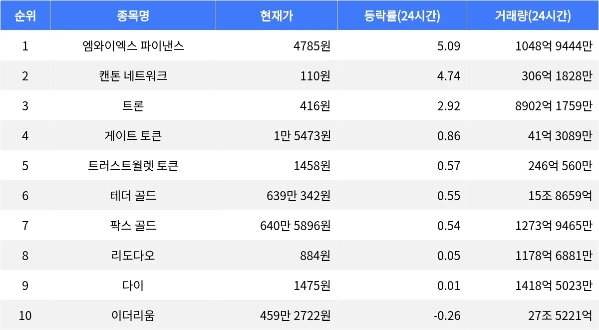 글로벌 가상자산 시황 중계 사이트 코인마켓캡(CoinMarketCap)에 따르면, 최근 암호화폐 시장에서 엠와이엑스 파이낸스가 24시간 등락률 5.09%로 가장 높은 상승률을 기록하며 주목받고 있다. 현재 엠와이엑스 파이낸스는 4785원에 거래되고 있으며, 24시간 거래량은 1048억 9444만에 달한다. 1시간 등락률도 1.09% 상승하면서 단기적으로 긍정적인 흐름을 보이고 있다.