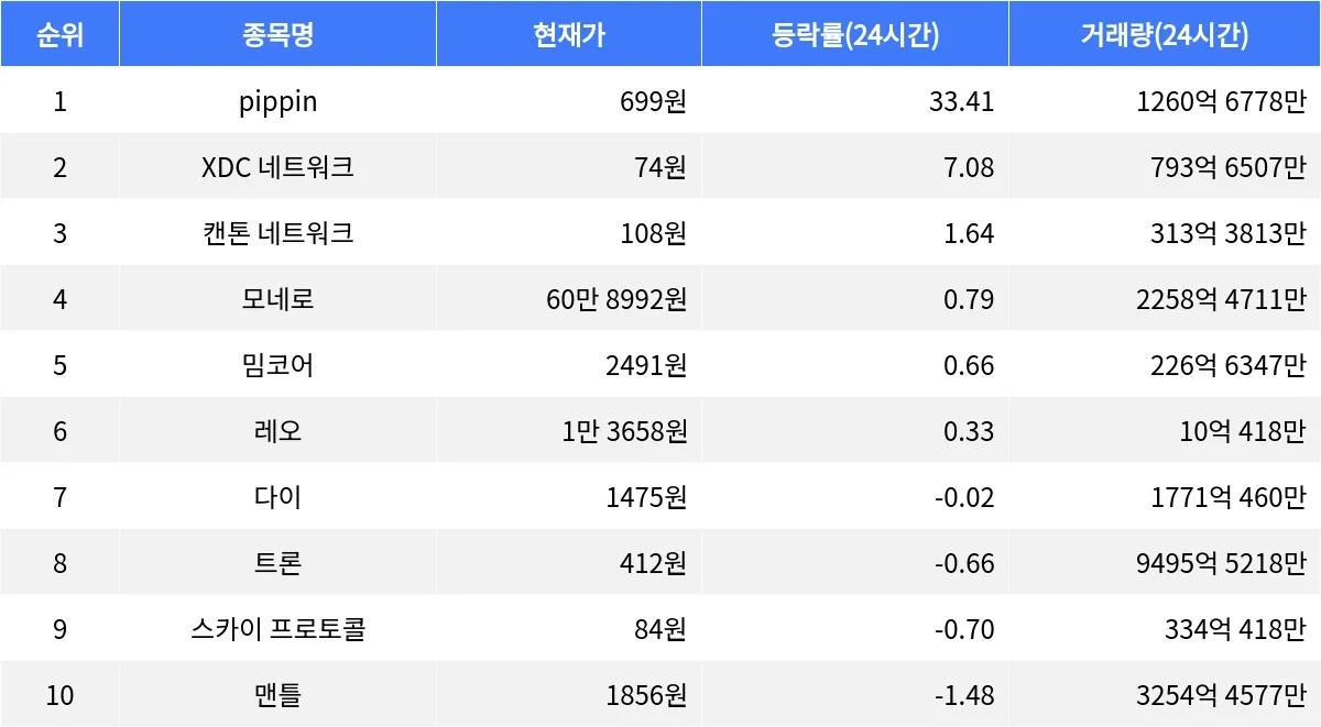 pippin은 최근 급격한 상승세를 보이며 주목받고 있으며, 특히 24시간 거래량이 크게 증가하여 시장의 관심을 받고 있다. XDC 네트워크는 안정적인 상승세를 유지하며, 네트워크의 확장성과 보안성을 바탕으로 꾸준한 성장을 보여주고 있다. 모네로는 익명성을 강조한 프라이버시 코인으로서, 여전히 많은 사용자에게 인기를 끌고 있다.