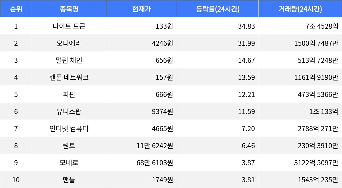 글로벌 가상자산 시황 중계 사이트 코인마켓캡(CoinMarketCap)에 따르면, 암호화폐 시장에서 나이트 토큰이 24시간 동안 34.83% 상승하며 가장 두드러진 성과를 보였다. 현재 나이트 토큰은 133원에 거래되고 있으며, 24시간 동안 7조 4528억 원의 거래량을 기록했다. 그러나 최근 1시간 동안 3.00% 하락세를 보이며 단기적인 조정 국면에 접어들었다.