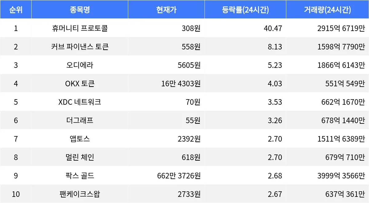 글로벌 가상자산 시황 중계 사이트 코인마켓캡(CoinMarketCap)에 따르면, 암호화폐 시장에서 휴머니티 프로토콜이 24시간 동안 40.47% 상승하며 가장 높은 등락률을 기록했다. 현재 휴머니티 프로토콜은 308원에 거래되고 있으며, 24시간 동안 2915억 6719만 원의 거래량을 보였다. 1시간 동안 2.52% 상승하며 단기 상승세를 이어가고 있다. 시가총액은 6793억 7166만 원으로 시가총액 순위 92위를 기록하고 있다.