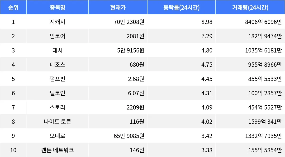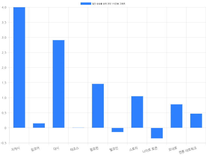 텔코인은 24시간 동안 4.31% 상승하며 6.07원에 거래되고 있다. 시가총액은 5774억 7065만 원으로 99위에 위치하며, 1시간 등락률은 -0.14%로 소폭 하락했다. 같은 시각, 스토리는 4.09% 상승하며 2209원에 거래 중이며, 1시간 동안 1.05% 상승했다. 시가총액 순위는 80위이다. 나이트 토큰은 4.02% 상승하며 116원에 거래되고 있으며, 시가총액 51위에 랭크되어 있다. 1시간 등락률은 -0.35%로 하락세를 보였다. 모네로는 3.42% 상승, 캔톤 네트워크는 3.38% 상승하며 각각 65만 9085원과 146원에 거래되고 있다.