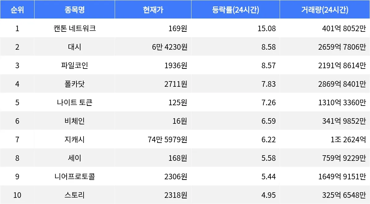 글로벌 가상자산 시황 중계 사이트 코인마켓캡(CoinMarketCap)에 따르면, 암호화폐 시장에서 캔톤 네트워크가 가장 높은 24시간 등락률을 기록하며 주목받고 있다. 캔톤 네트워크는 24시간 동안 15.08% 상승하며 현재 169원에 거래되고 있다. 특히 24시간 거래량은 401억 8052만 원에 이르렀으며, 시가총액 26위로 올라섰다. 1시간 등락률은 1.96%로, 매수세가 꾸준히 유지되고 있음을 보여준다.