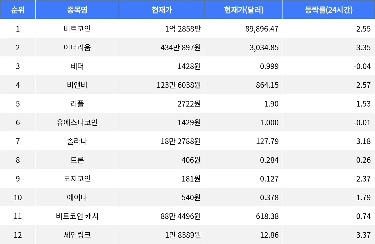 29일 글로벌 가상자산 시황 중계 사이트 코인마켓캡(CoinMarketCap)에 따르면, 비트코인은 현재 1억 2858만원에 거래되고 있으며, 24시간 동안 2.55% 상승했다. 비트코인은 최초의 가상자산으로, 탈중앙화된 네트워크를 통해 거래가 이루어지는 것이 특징이다. 24시간 거래량은 38조 8395억원에 달한다.