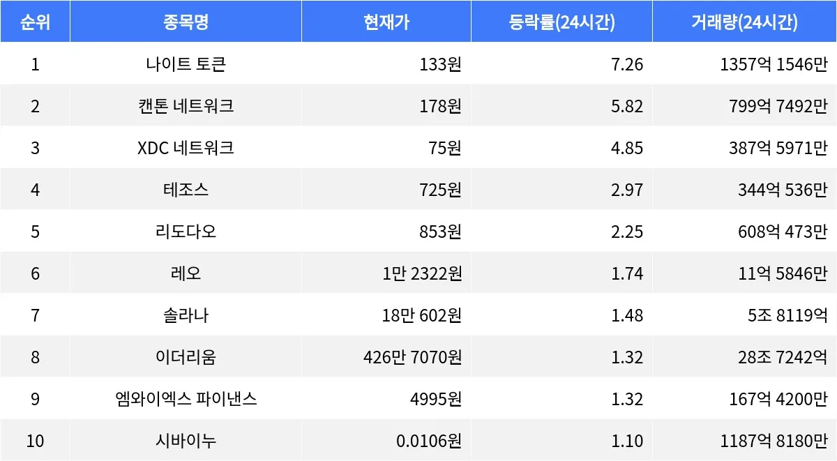 글로벌 가상자산 시황 중계 사이트 코인마켓캡(CoinMarketCap)에 따르면, 24시간 동안 암호화폐 시장에서 나이트 토큰이 가장 높은 상승률을 기록하며 주목받고 있다. 나이트 토큰은 최근 24시간 동안 7.26% 상승하여 현재 133원에 거래되고 있으며, 거래량은 1357억 1546만 주로 활발한 거래가 이루어지고 있다. 그러나, 1시간 차원에서는 -1.14% 하락하며 단기적으로는 조정 국면에 진입한 모습이다.