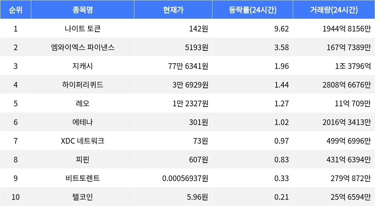 글로벌 가상자산 시황 중계 사이트 코인마켓캡(CoinMarketCap)에 따르면, 현재 암호화폐 시장에서 나이트 토큰이 24시간 동안 9.62% 상승하며 가장 높은 등락률을 기록하고 있다. 나이트 토큰은 현재 142원에 거래되고 있으며, 24시간 동안 1944억 8156만 원의 거래량을 기록했다. 1시간 등락률은 -0.08%로 소폭 하락했으나, 전반적인 상승세는 유지되고 있다.