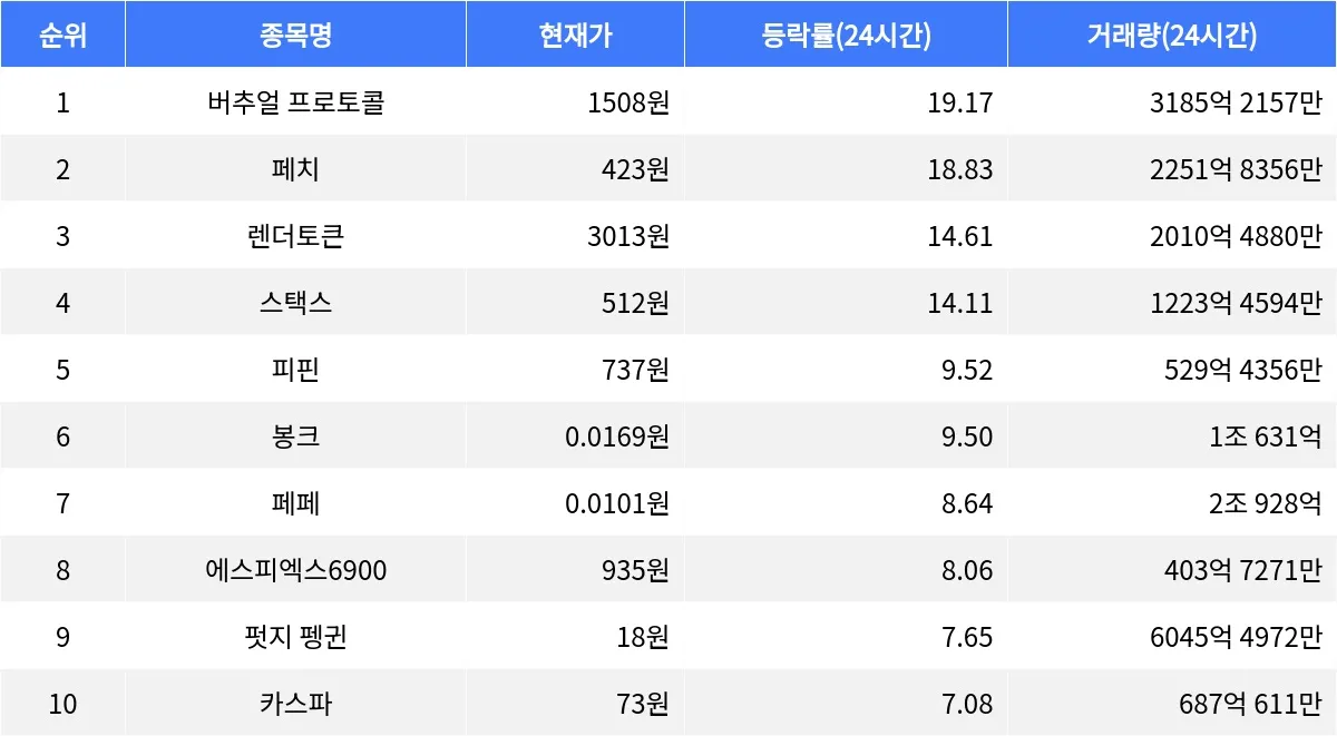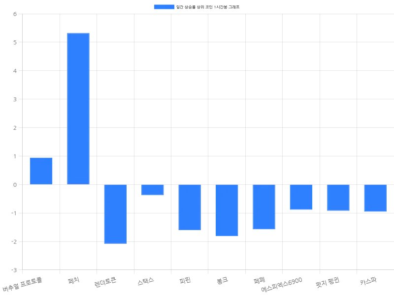 봉크는 24시간 동안 9.50% 상승하며 0.0169원에 거래되고 있으며, 1시간 동안 1.81% 하락했다. 페페는 8.64% 상승하며 0.0101원에 거래되고 있고, 1시간 동안 1.57% 하락했다. 에스피엑스6900은 24시간 동안 8.06% 상승하여 935원에 거래 중이고, 1시간 동안 0.88% 하락을 기록했다. 펏지 펭귄은 7.65% 상승하여 18원에 거래되고 있으며, 1시간 동안 0.92% 하락했다. 카스파는 24시간 동안 7.08% 상승하여 73원에 거래되고 있으며, 1시간 동안 0.95% 하락했다.