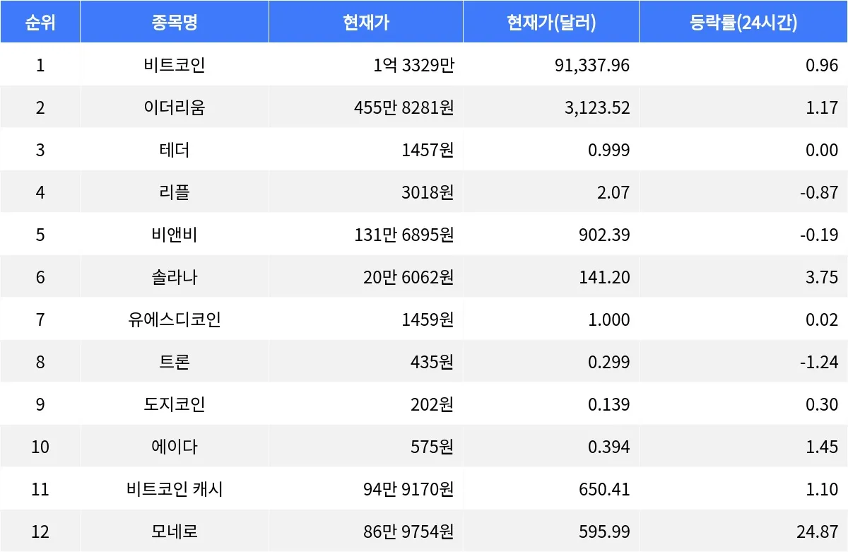 이더리움은 455만 8281원에 거래되고 있으며, 24시간 등락률은 1.17% 상승했다. 이더리움은 스마트 계약 기능을 지원하는 플랫폼으로, 다양한 분산 애플리케이션을 개발할 수 있는 환경을 제공한다. 24시간 거래량은 17조 1176억원이다.