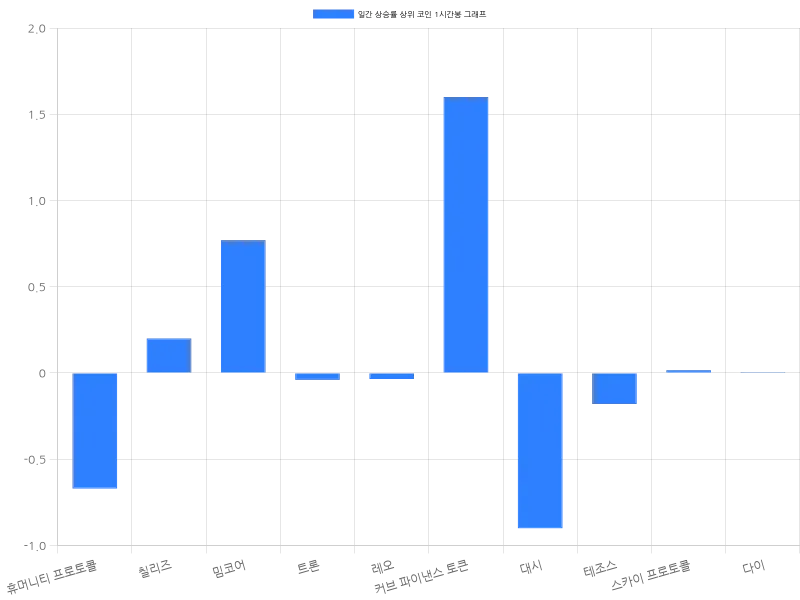 한편, 커브 파이낸스 토큰은 24시간 동안 2.21% 상승하며 643원에 거래되고 있고, 1시간 동안 1.60% 상승하며 강한 상승세를 나타내고 있다. 대시는 24시간 동안 0.69% 상승하며 11만 8828원에 거래되고 있으며, 최근 1시간 동안 -0.90%의 조정을 보였다. 테조스는 24시간 동안 0.57% 상승하여 854원에 거래되고 있으며, 1시간 동안 -0.18% 하락했다. 스카이 프로토콜은 24시간 동안 0.15% 상승하며 88원에 거래되고 있으며, 1시간 동안에는 0.02%의 미미한 변동을 보였다. 다이는 24시간 동안 -0.03% 하락하며 1469원에 거래되고 있으며, 1시간 동안 0% 변동을 보였다.