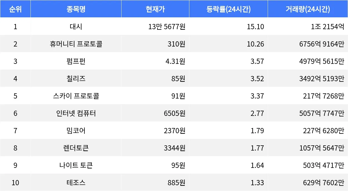 휴머니티 프로토콜 역시 강세를 보이고 있다. 24시간 동안 10.26% 상승하며 현재 310원에 거래 중이다. 24시간 거래량은 6756억 9164만 원으로, 시가총액 순위 98위를 기록하고 있다. 최근 1시간 동안 1.85% 상승하며 단기적으로도 긍정적인 흐름을 보이고 있다.