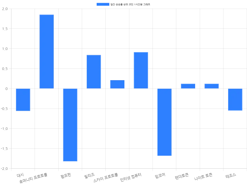인터넷 컴퓨터는 24시간 동안 2.77% 상승하며 6505원에 거래되고 있다. 1시간 동안 0.91% 상승하여 단기적으로도 긍정적인 움직임을 보인다. 밈코어는 24시간 동안 1.79% 상승하며 2370원에 거래되고 있지만, 1시간 동안 1.68% 하락하면서 약간의 조정세를 보이고 있다. 렌더토큰은 24시간 동안 1.77% 상승하며 3344원에 거래 중이며, 1시간 동안 0.12%의 미미한 상승세를 보이고 있다. 나이트 토큰은 24시간 동안 1.64% 상승, 95원에 거래 중이며 1시간 동안 0.12% 상승하고 있다. 테조스는 24시간 동안 1.33% 상승하며 885원에 거래되고 있지만, 1시간 동안 0.55% 하락하여 단기 조정세를 보이고 있다.