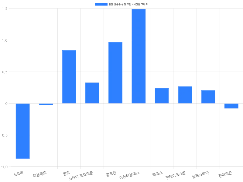 한편, 이뮤터블엑스는 24시간 동안 7.14% 상승하며 419원에 거래되고 있으며, 시가총액 순위는 88위다. 테조스는 6.89% 상승하여 904원에 거래되고 있으며, 시가총액 순위는 81위에 자리하고 있다. 팬케이크스왑은 5.04% 상승, 셀레스티아는 4.08% 상승, 렌더토큰은 3.57% 상승을 기록하며 각각의 가격은 3129원, 855원, 3333원에 거래되고 있다.