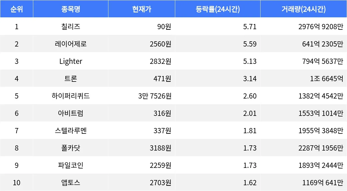 글로벌 가상자산 시황 중계 사이트 코인마켓캡(CoinMarketCap)에 따르면, 현재 암호화폐 시장에서 칠리즈가 가장 높은 24시간 등락률을 기록하며 주목받고 있다. 칠리즈는 24시간 동안 5.71% 상승하여 현재 90원에 거래되고 있으며, 24시간 거래량은 약 2976억 9208만원에 달하고 있다. 시가총액은 9296억 1646만원으로, 시가총액 순위는 84위에 자리하고 있다. 하지만 최근 한 시간 동안은 0.99% 하락하여 단기적인 조정이 발생했다.