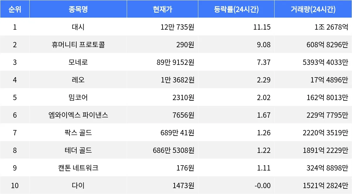 글로벌 가상자산 시황 중계 사이트 코인마켓캡(CoinMarketCap)에 따르면, 현재 암호화폐 시장에서 대시(Dash)가 24시간 등락률 11.15%로 가장 높은 상승세를 보이고 있다. 대시는 1조 2678억 원의 거래량을 기록하며, 현재 12만 735원에 거래되고 있다. 최근 1시간 동안에도 1.47% 상승하며 상승세를 지속하고 있다.