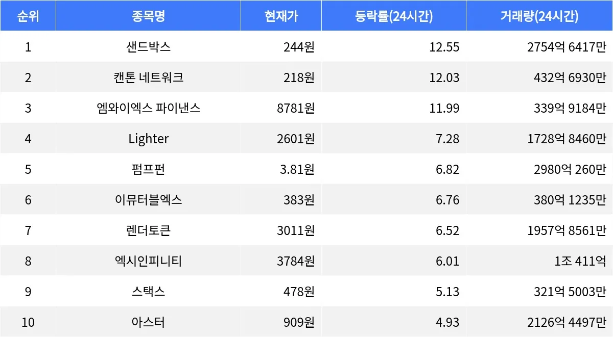 이뮤터블엑스는 24시간 동안 6.76% 상승하며 현재 383원에 거래되고 있다. 1시간 등락률은 -0.94%로 소폭 하락 중이다. 렌더토큰은 6.52% 상승하며 3011원에 거래 중이며, 1시간 등락률은 -0.91%를 기록하고 있다. 엑시인피니티는 6.01% 상승하여 3784원에 거래되고 있으며, 1시간 등락률은 -0.46%이다. 스택스는 5.13% 상승하며 478원에 거래되고 있으며, 1시간 등락률은 -0.70%이다. 아스터는 4.93% 상승하여 909원에 거래되고 있으며, 1시간 등락률은 0.46% 상승 중이다.
