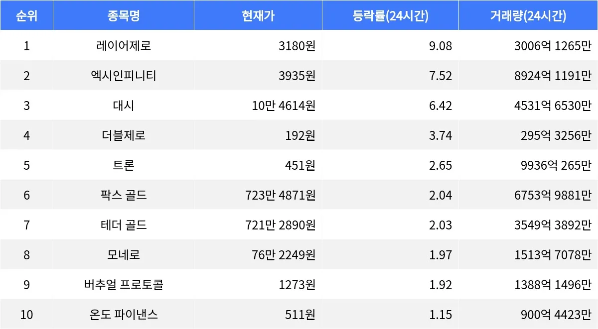 한편, 팍스 골드는 24시간 동안 2.04% 상승하며 현재 723만 4871원에 거래되고 있다. 테더 골드는 2.03% 상승하며 721만 2890원에 거래 중이다. 모네로는 1.97% 상승하며 76만 2249원에 거래되고 있으며, 버추얼 프로토콜은 1.92% 상승하며 1273원에 거래되고 있다. 온도 파이낸스는 1.15% 상승하며 511원에 거래 중이다.