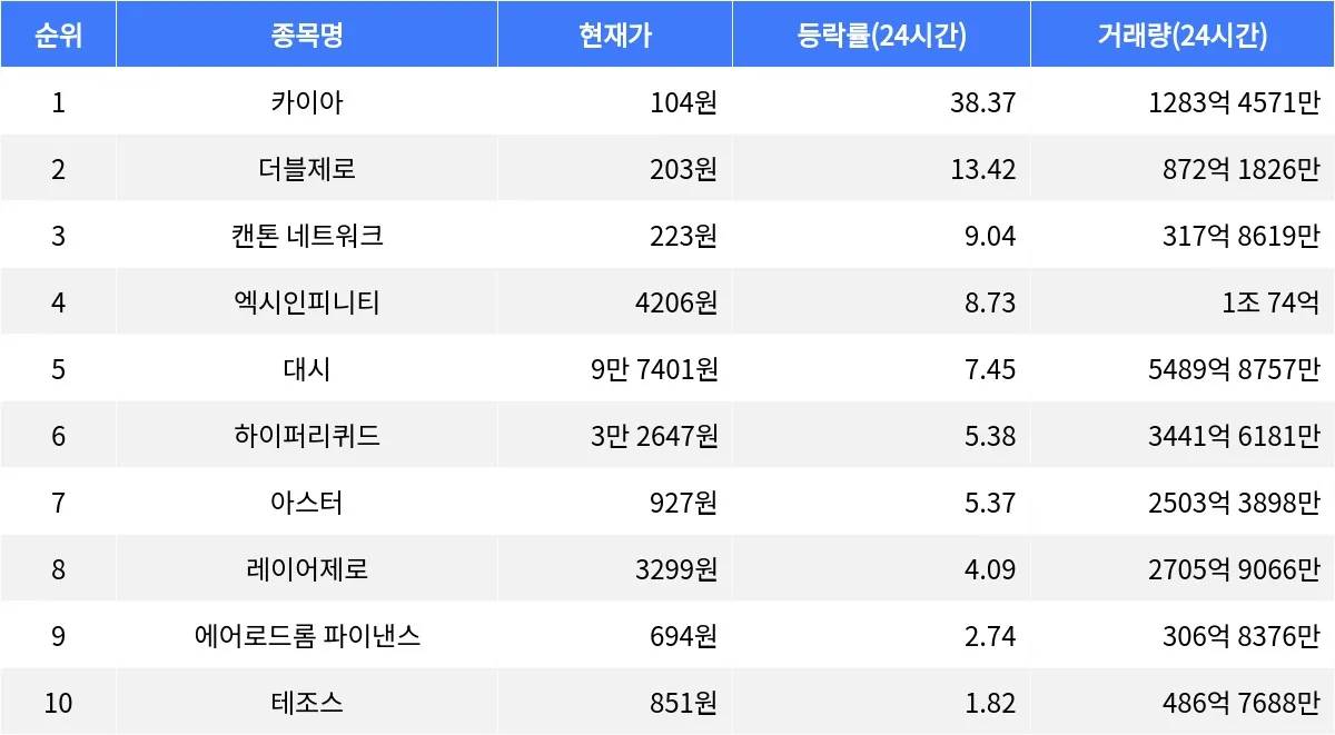 더블제로는 24시간 동안 13.42% 상승하며 203원에 거래 중이다. 더블제로의 24시간 거래량은 872억 1826만 주로, 시가총액 92위에 위치해 있다. 1시간 등락률은 1.47%로, 카이아와 마찬가지로 상승세를 유지하고 있다.