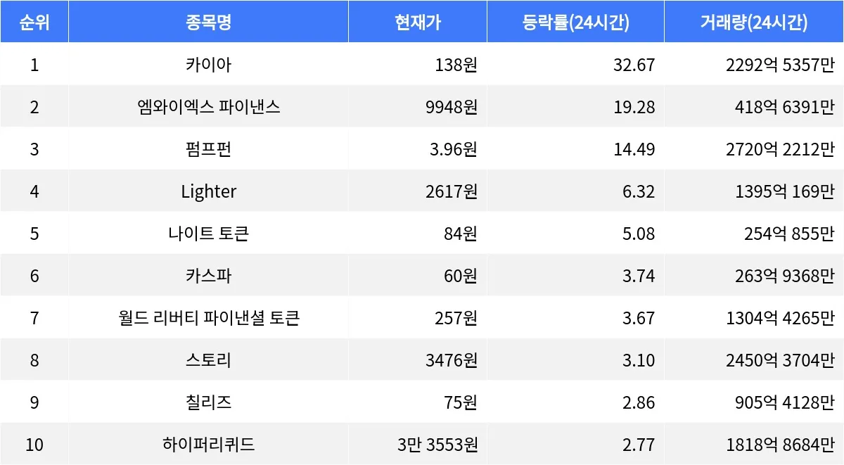 카이아는 최근 높은 거래량과 상승세를 바탕으로 주목받고 있는 암호화폐 중 하나다. 시가총액 82위를 기록하며, 투자자들 사이에서의 인기가 급증하고 있다. 블록체인 기술을 활용한 다양한 응용 프로그램을 통해 생태계 확장을 추진하고 있다.