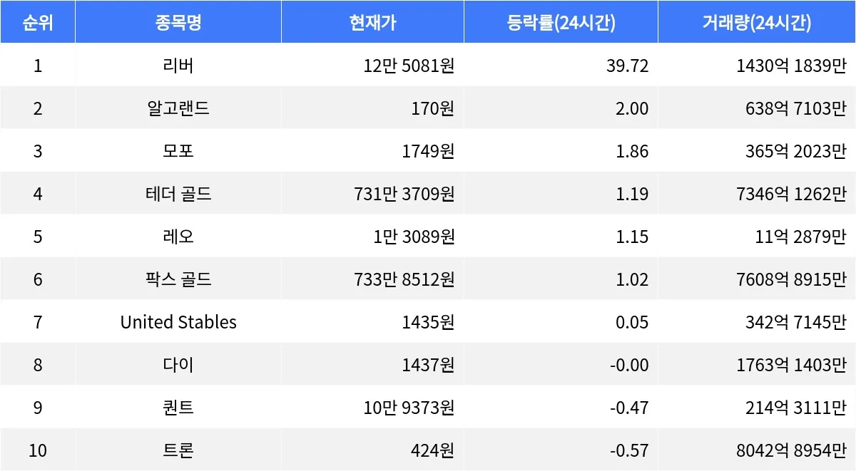 글로벌 가상자산 시황 중계 사이트 코인마켓캡(CoinMarketCap)에 따르면, 최근 암호화폐 시장에서 리버가 24시간 동안 39.72% 급등하며 큰 주목을 받고 있다. 리버는 현재 12만 5081원에 거래되고 있으며, 24시간 거래량은 1430억 1839만 원에 달한다. 시가총액은 2조 4515억 원으로 45위에 올라 있으며, 1시간 등락률은 2.31% 상승을 기록했다. 이러한 상승세는 지속적인 매수세에 힘입은 것으로 보인다.