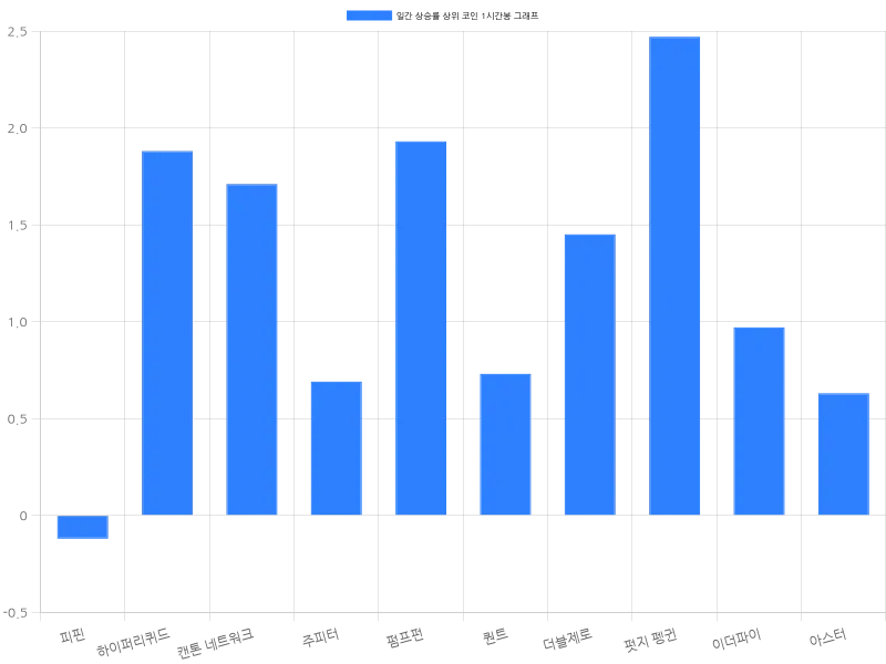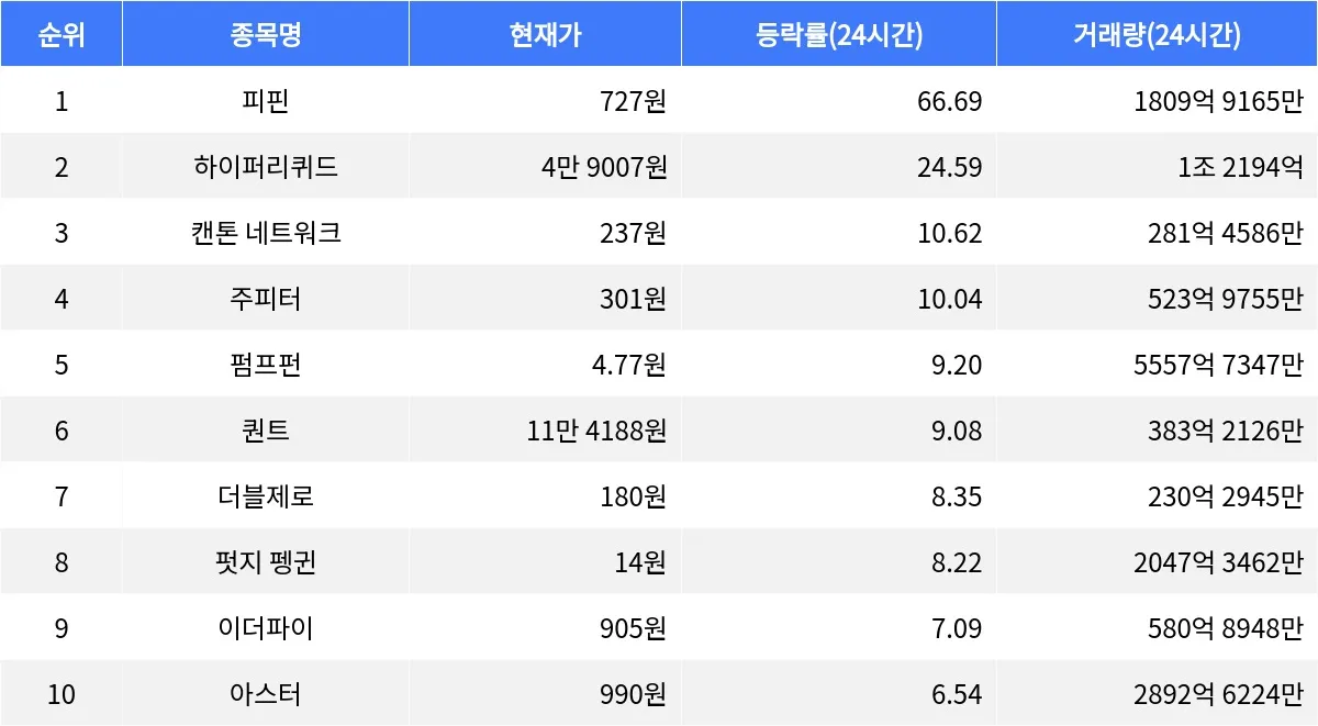 펏지 펭귄(Pudge Penguin)은 8.22% 상승하여 14원에 거래되고 있으며, 1시간 동안 2.47% 상승했다. 이더파이(EtherFi)는 7.09% 상승하며 905원에 거래되고 있고, 최근 1시간 동안 0.97% 상승하였다. 아스터(Aster)는 6.54% 상승하여 990원에 거래되고 있으며, 1시간 동안 0.63% 상승했다.