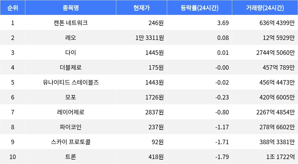글로벌 가상자산 시황 중계 사이트 코인마켓캡(CoinMarketCap)에 따르면, 암호화폐 시장에서 캔톤 네트워크가 24시간 등락률 1위를 기록하며 주목받고 있다. 캔톤 네트워크는 24시간 동안 3.69% 상승하며 현재 246원에 거래되고 있다. 시가총액은 9조 2458억 원으로 17위에 랭크되어 있으며, 거래량은 636억 4399만 원에 달했다. 그러나 1시간 등락률은 -1.95%로 소폭 하락세를 보이고 있어 단기적인 조정 가능성도 엿보인다.