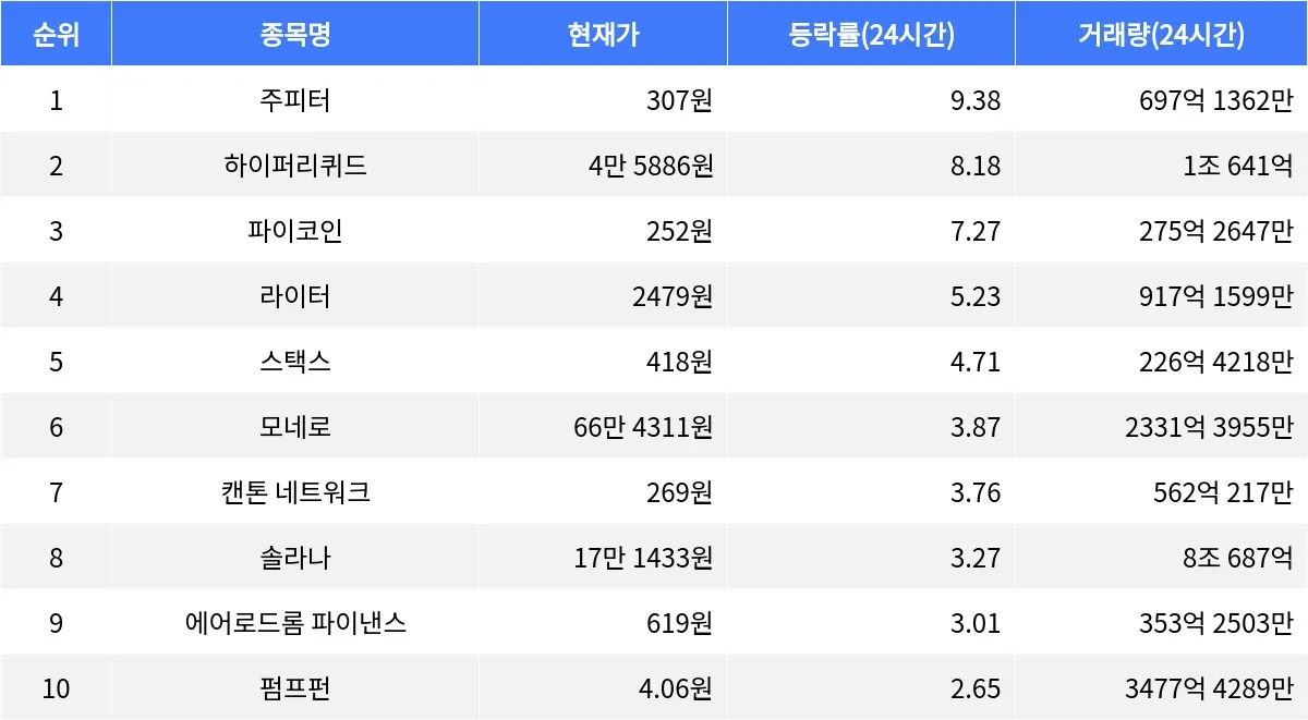 시가총액 48위의 파이코인은 24시간 동안 7.27% 상승하며 252원에 거래되고 있다. 한 시간 동안 1.62% 상승세를 보이며 상승 추세가 유지되고 있다. 라이터는 24시간 동안 5.23% 상승하며 2479원에 거래되고 있으며, 1시간 동안 0.59% 하락한 점은 주의 요인이다. 시가총액 94위에 위치한 라이터의 거래량은 917억 1599만 원이다. 스택스는 24시간 동안 4.71% 상승하며 418원에 거래되고 있다. 1시간 동안 0.79% 하락했으나, 상대적으로 안정적인 상승세를 유지하고 있다.