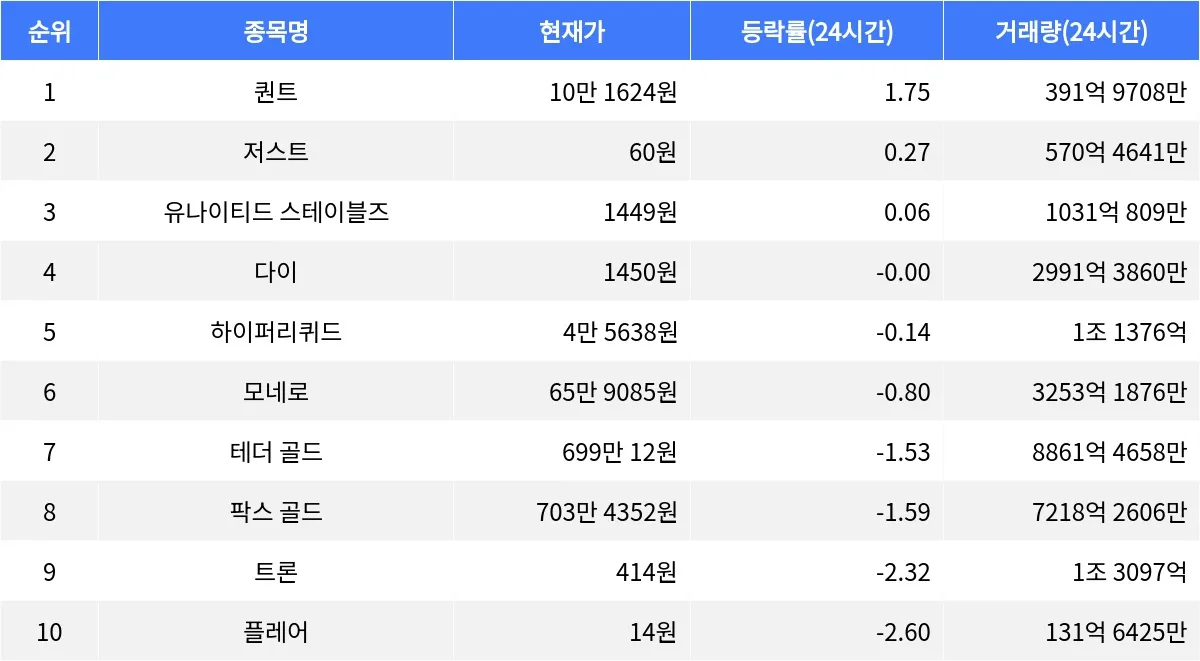 트론은 24시간 동안 2.32% 하락하며 414원에 거래되고 있으며, 시가총액 8위로 상위권을 유지하고 있다. 플레어는 24시간 동안 2.60% 하락하여 14원에 거래되고 있으며, 시가총액 65위를 기록하고 있다.