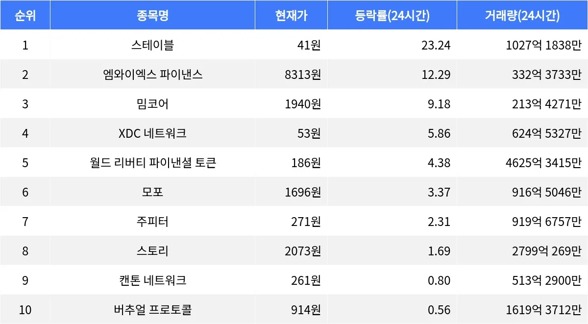 스테이블은 최근 암호화폐 시장에서 주목받고 있는 종목으로, 높은 거래량과 상승률을 기록하며 강세를 보이고 있다. 엠와이엑스 파이낸스는 금융 서비스 분야에서 활용되는 암호화폐로, 안정적인 상승세를 유지하고 있다. 밈코어는 소셜 미디어 및 콘텐츠 제작 플랫폼에서 주로 사용되며, 꾸준한 상승세를 보이고 있다.