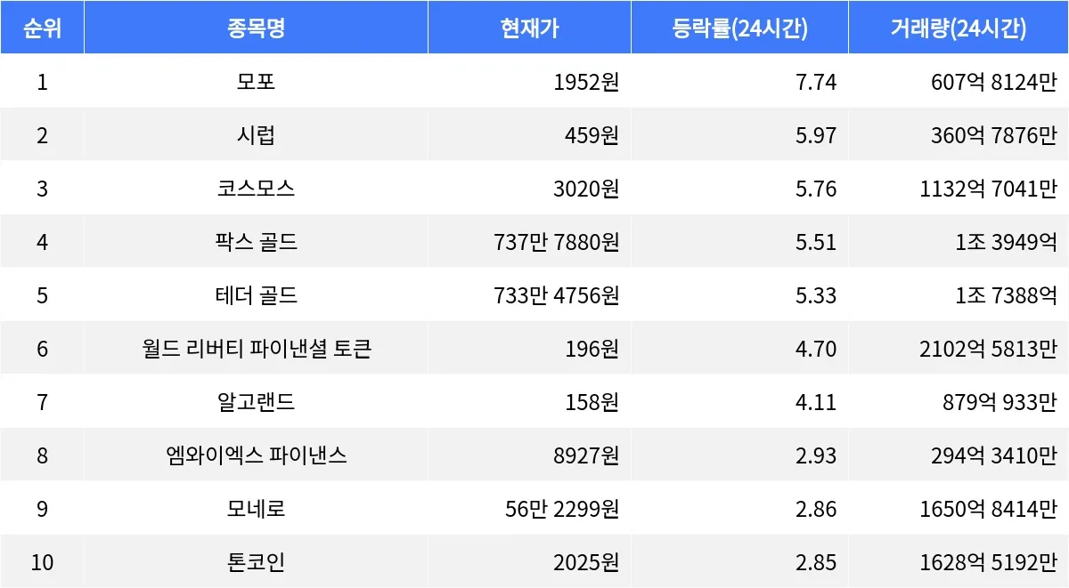 모포는 최근 급등한 1시간 등락률로 단기 투자자들에게 높은 관심을 받고 있다. 시럽 또한 안정적인 상승세를 유지하며 투자자들에게 긍정적인 신호를 보내고 있다. 코스모스는 블록체인 상호운용성을 목표로 하며, 다양한 블록체인 네트워크 간의 연결성을 강화하는 프로젝트로 주목받고 있다. 팍스 골드와 테더 골드는 금 가격을 기반으로 한 스테이블 코인으로, 금과 연동된 가치 저장 수단을 제공하고 있다.