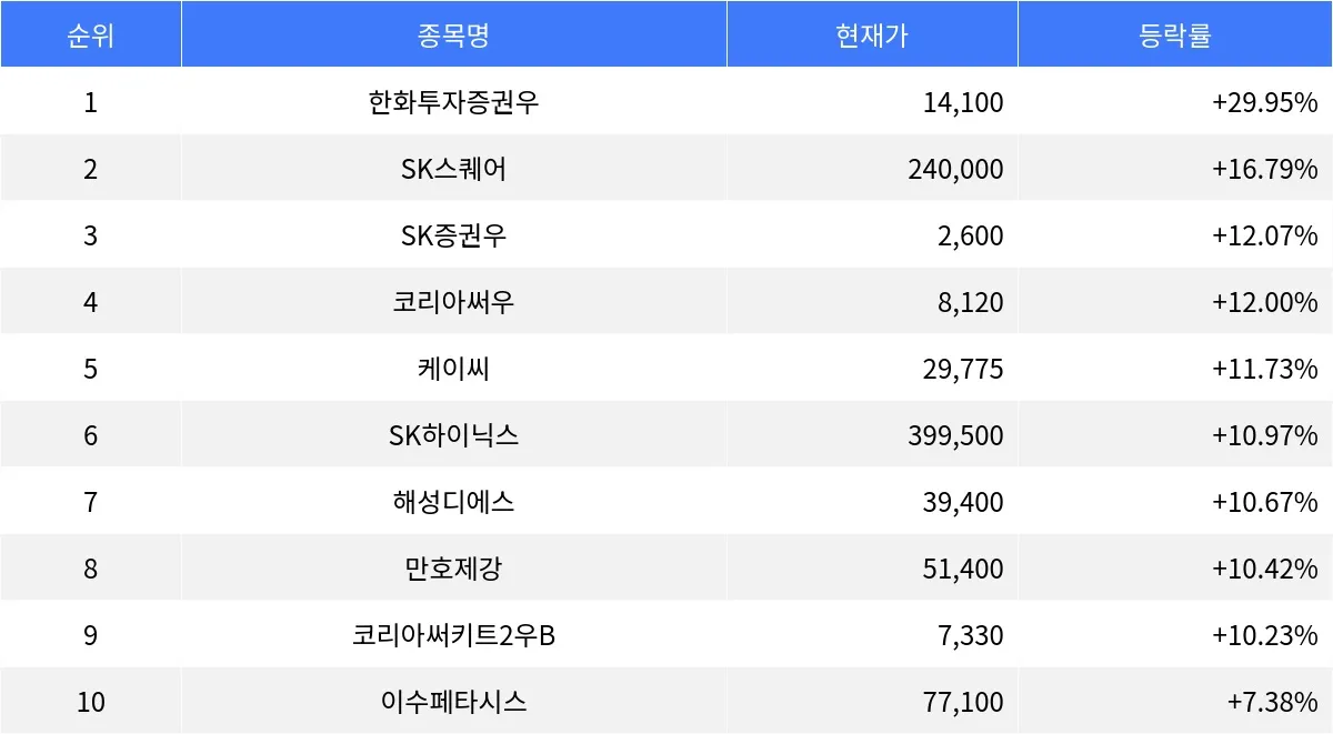 SK스퀘어, SK증권우 등 주요 종목 상승세 지속