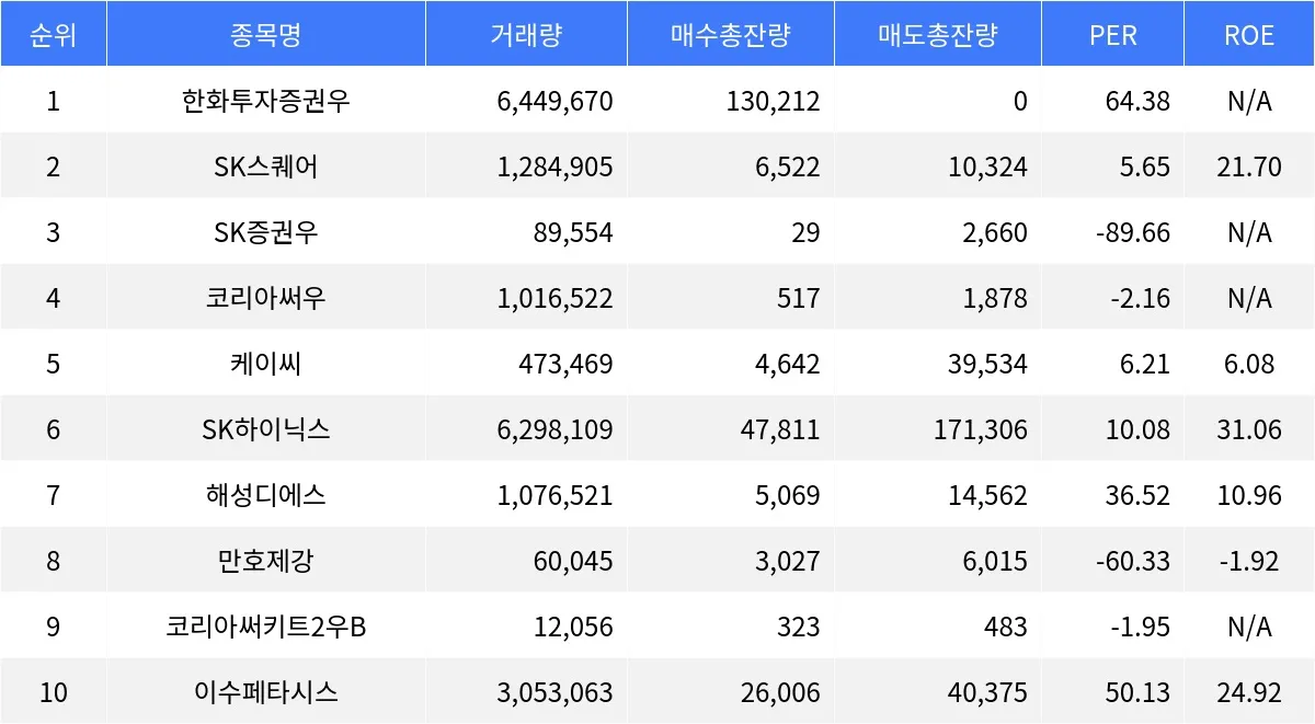 한화투자증권우의 거래량이 6,449,670주로 가장 많았으며, 매수총잔량은 130,212주, 매도총잔량은 0주로 매수세가 강하게 나타났다. SK스퀘어의 매도총잔량은 10,324주로 매도 우위의 수급 상황을 보였다. SK하이닉스는 6,298,109주의 거래량을 기록하며 거래가 활발했다. 해성디에스는 1,076,521주의 거래량을 기록했으며 매수총잔량은 5,069주, 매도총잔량은 14,562주로 매도세가 강했다.