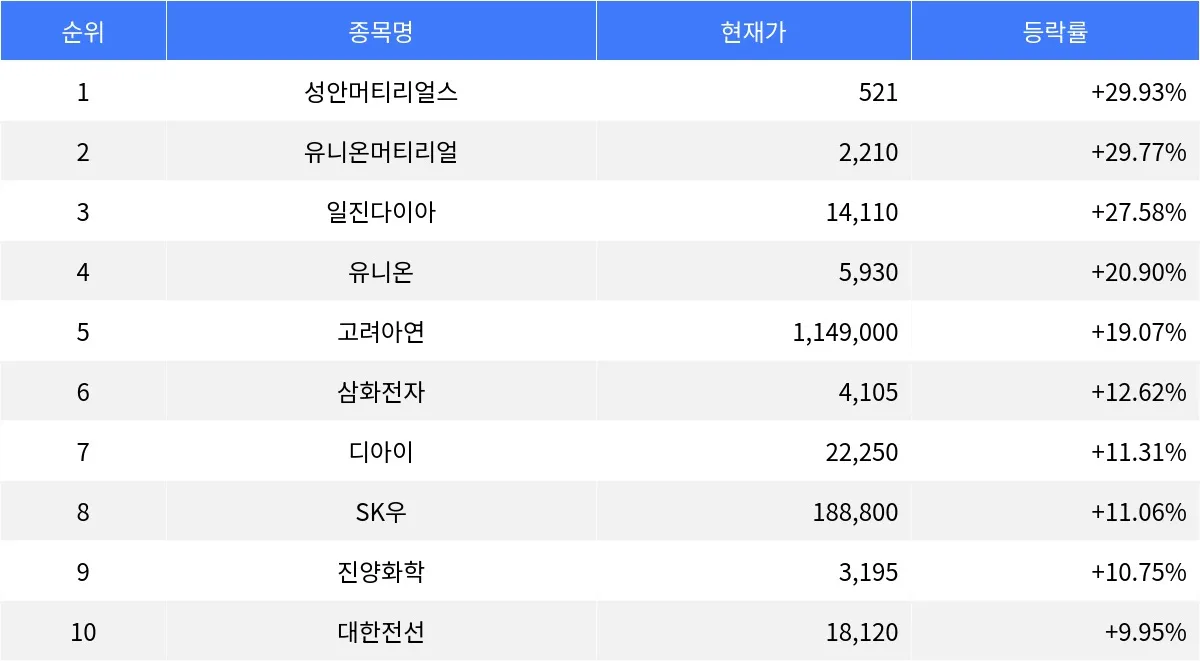 삼화전자(011230), 디아이(003160), SK우(03473K), 진양화학(051630), 대한전선(001440)은 각각 12.62%, 11.31%, 11.06%, 10.75%, 9.95%의 등락률을 기록하며, 현재가 4,105원, 22,250원, 188,800원, 3,195원, 18,120원으로 장을 마쳤다.