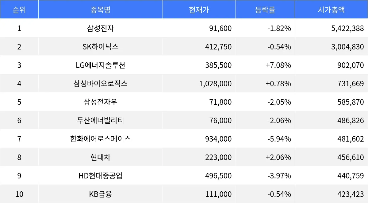 삼성전자 -1.82%, SK하이닉스 -0.54%, LG에너지솔루션 +7.08%...