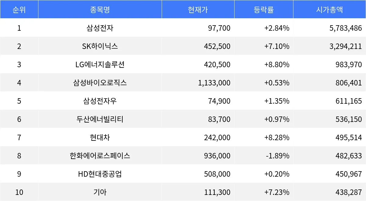 삼성전자 +2.84%, SK하이닉스 +7.10%, LG에너지솔루션 +8.80%...