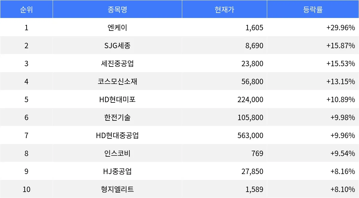 6위부터 10위까지는 각각 한전기술(052690)(9.98%, 105,800원), HD현대중공업(329180)(9.96%, 563,000원), 인스코비(006490)(9.54%, 769원), HJ중공업(097230)(8.16%, 27,850원), 형지엘리트(093240)(8.10%, 1,589원)을 기록했다.