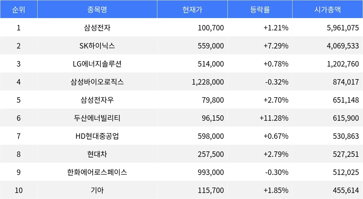 삼성전자 +1.21%, SK하이닉스 +7.29%, LG에너지솔루션 +0.78%...