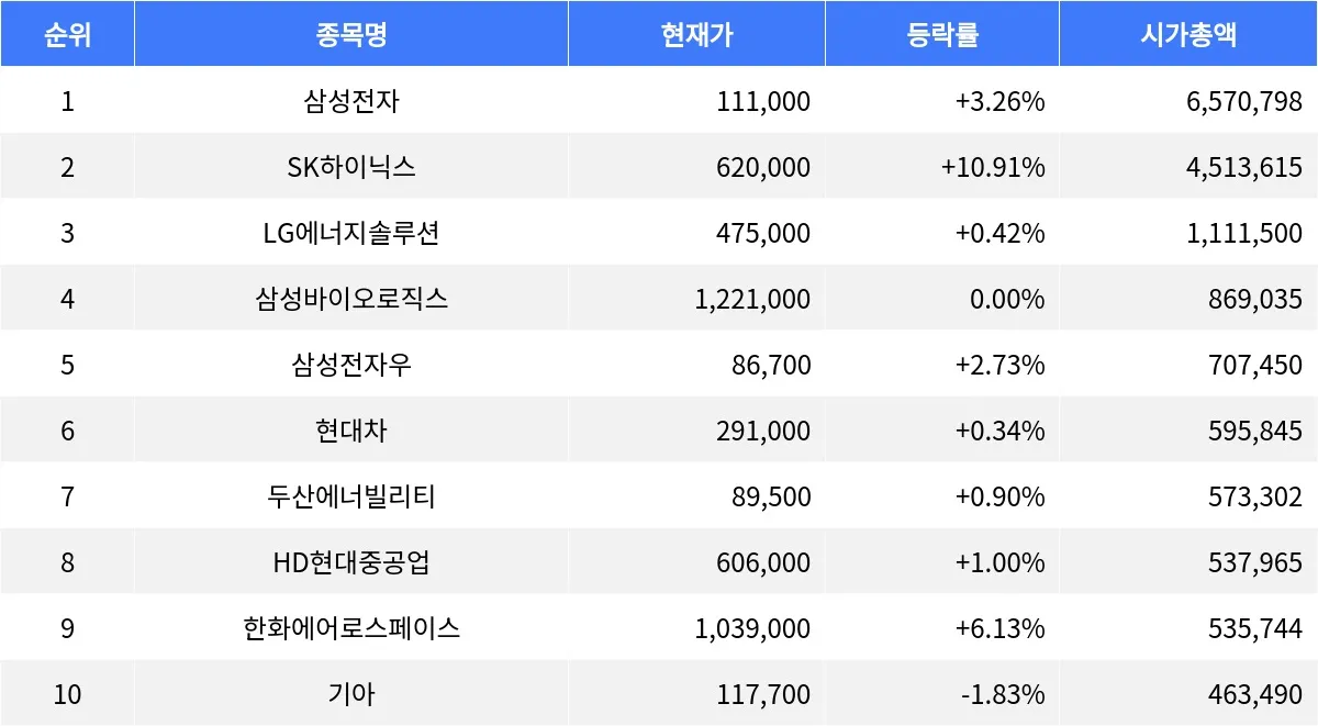 삼성전자 +3.26%, SK하이닉스 +10.91%, LG에너지솔루션 +0.42%...