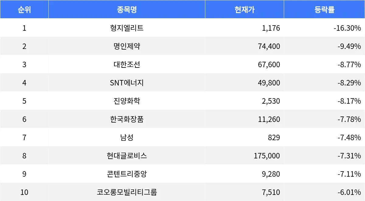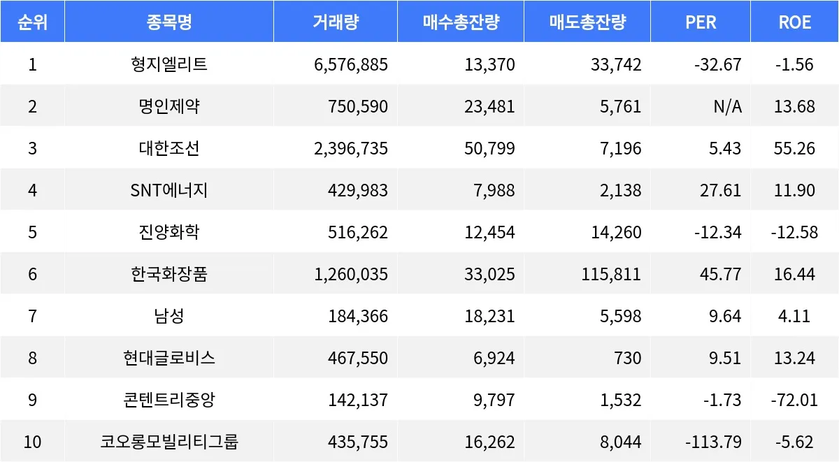 형지엘리트 등락률 하락과 거래량 1위, 대한조선 PER 최저 기록