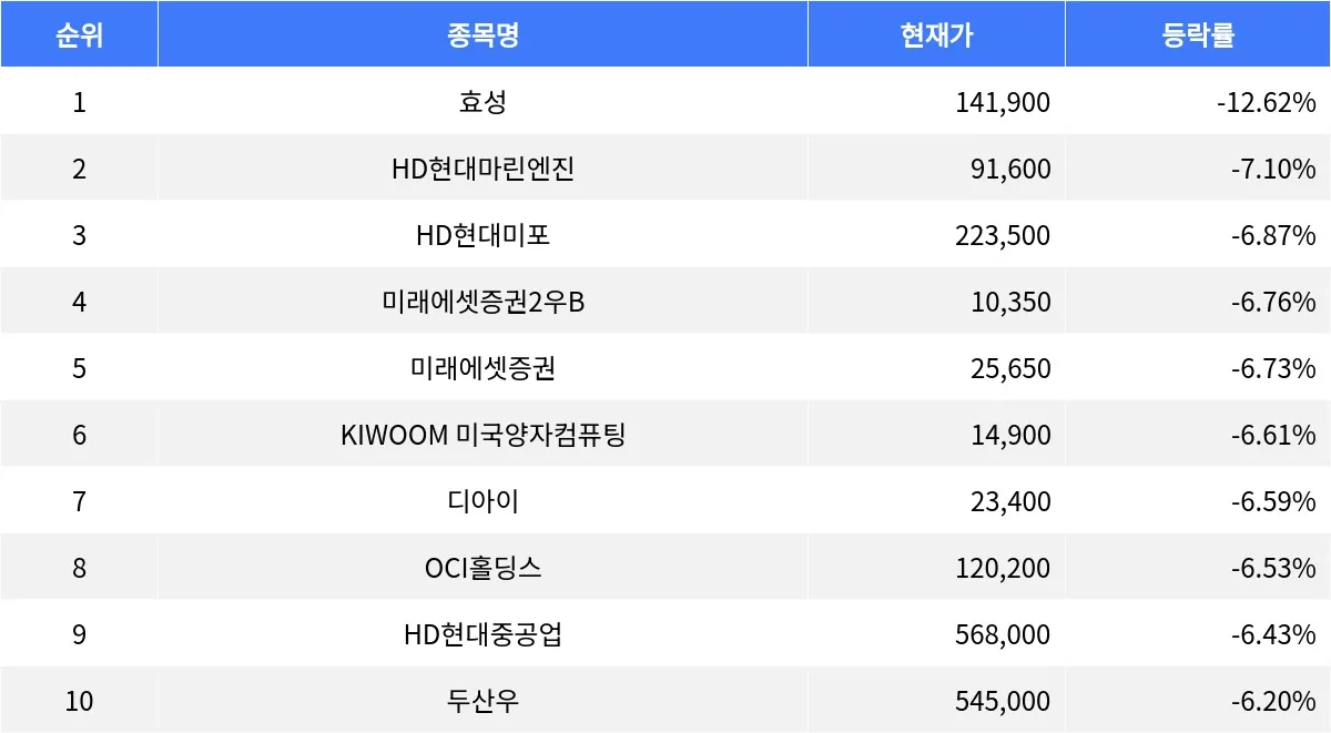6위부터 10위까지의 종목은 각각 등락률 -6.61%에서 -6.20% 사이를 기록했다. 현재가는 각각 14,900원, 23,400원, 120,200원, 568,000원, 545,000원으로 집계되었다.