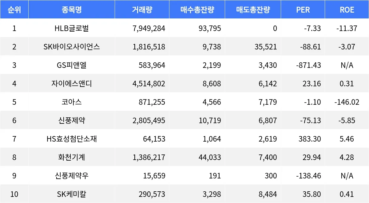 HLB글로벌은 거래량이 7,949,284주로 가장 많았으며, 매수세가 강하게 나타났다. SK바이오사이언스는 매도세가 우위를 점했으나, 높은 거래량을 기록했다. GS피앤엘은 매도세가 우위를 점하며, 거래량은 상대적으로 적었다. 자이에스앤디는 매수세가 우위를 점하며, 긍정적인 수급 구조를 보였다. 코아스는 매도세가 우위를 보였으며, 거래량은 비교적 낮았다.