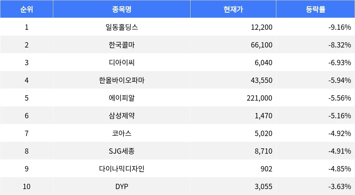 일동홀딩스, 한국콜마 등 주요 종목 하락세, 매수세 강한 종목도 다수