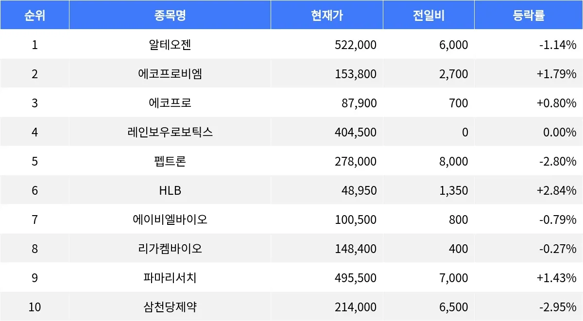 반면, 4위 레인보우로보틱스(277810)는 보합세로 40만4,500원에 마감했다. 5위 펩트론(087010)은 27만8,000원으로 2.80% 하락했다. 7위 에이비엘바이오(298380)는 10만500원으로 0.79% 하락했고, 8위 리가켐바이오(141080)는 14만8,400원으로 0.27% 하락했다. 10위 삼천당제약(000250)은 21만4,000원으로 2.95% 하락했다.