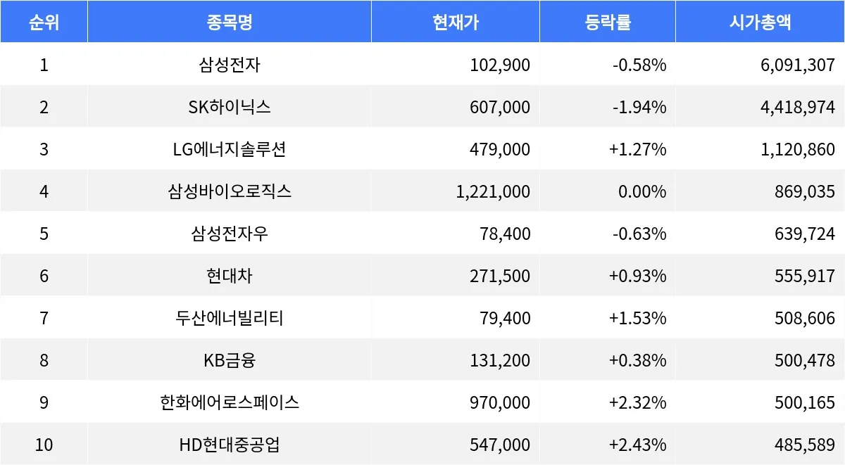 삼성전자 -0.58%, SK하이닉스 -1.94%, LG에너지솔루션 +1.27%...