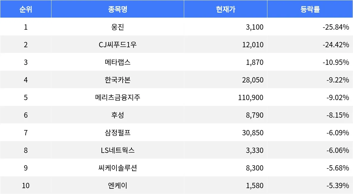 웅진, CJ씨푸드1우 등 대형 종목 하락세 지속하며 장 마감
