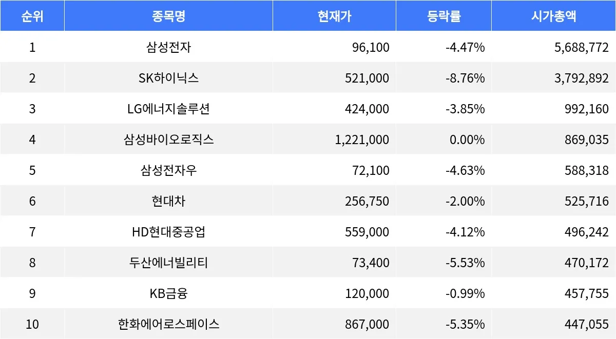 삼성전자 -4.47%, SK하이닉스 -8.76%, LG에너지솔루션 -3.85%...