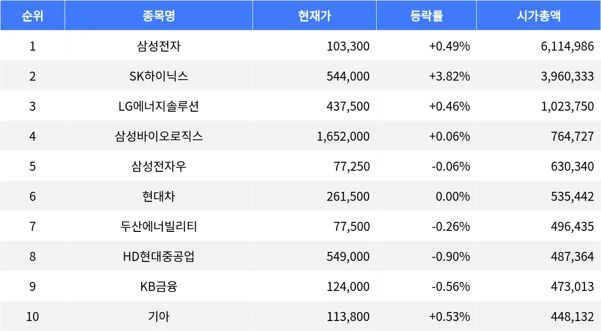 삼성전자 +0.49%, SK하이닉스 +3.82%, LG에너지솔루션 +0.46%...